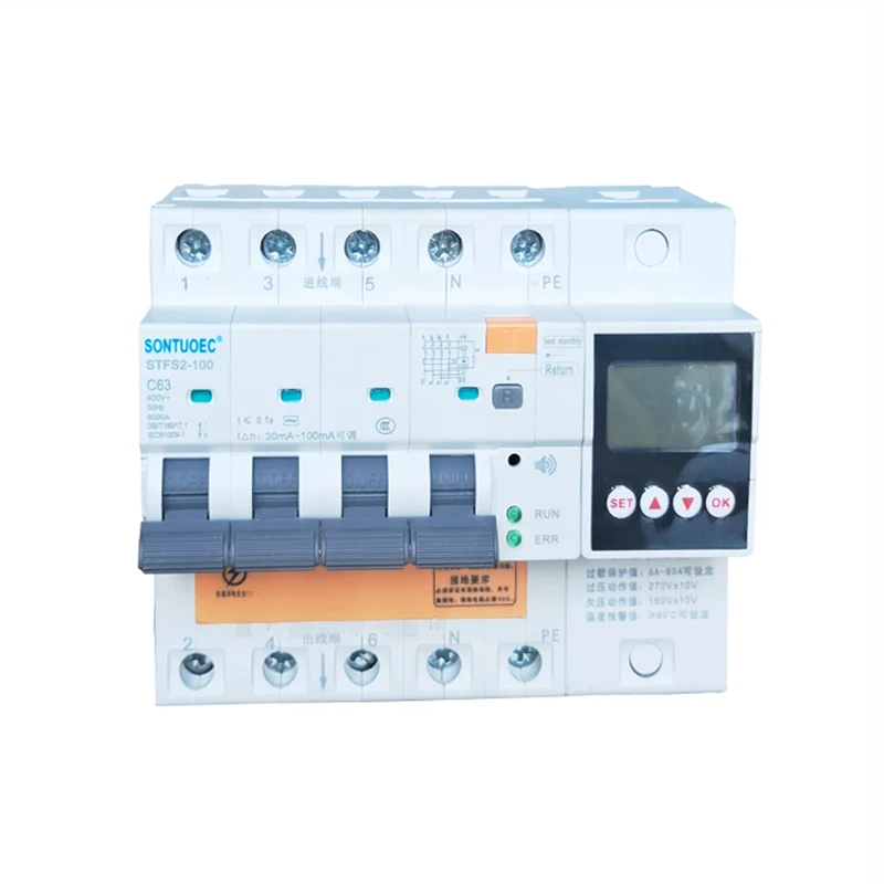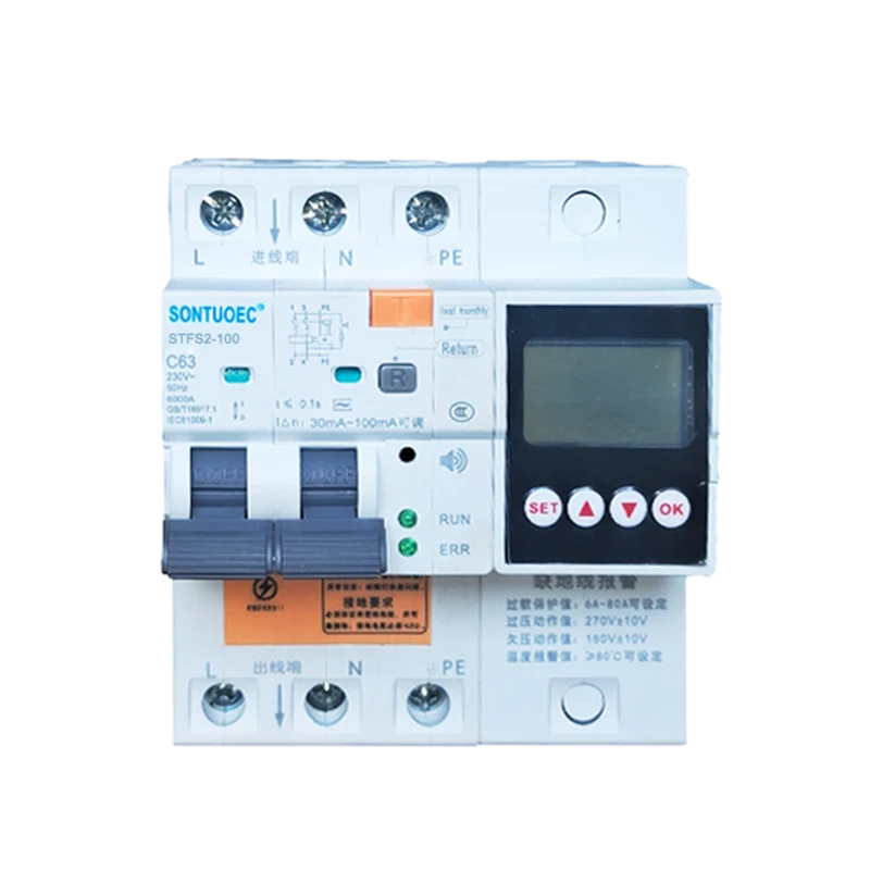 STSF2-100 100A 2P 4P Çok Fonksiyonlu RCBO, AC 50/60Hz için uygundur, aperson elektrikli olduğunda veya güç ızgarası sızıntıları olduğunda 230V-400V voltajı olan bir devrede ve 100A nominal akımı olan bir devrede derecelendirilir. Sızıntı, aşırı gerilim ve düşük voltaj ayarlanan değerlere ulaştığında, artık akım devre kesici çok kısa bir süre içinde hızla çalışabilir, güç kaynağını hızlı bir şekilde kesebilir. Kalan akım devre kesicinin izleme sıcaklığı ayarlanan değere ulaştığında, izleme topraklama kablosu bağlı değildir. Bağlandığında, ürün personel ve elektrikli ekipmanın güvenliğini korumak için bir alarm sesi yayar ve önleyebilir Güç ızgarasındaki aşırı gerilimin neden olduğu ekipmanın hasarını önleyin. Aşırı yük, kısa devre, sızıntı, aşırı gerilim düşük gerilim ve aşırı sıcaklık koruma fonksiyonları, normal koşullar altında elektrikli cihazları aralıklı olarak açmak ve kapatmak için de kullanılabilir. Aydınlatma devreleri, özellikle endüstriyel ve ticari aydınlatma dağıtım sistemleri için uygundur. Ürün, diğer benzer ürünlerden daha küçük bir hacim, kompakt yapıya ve daha iyi maliyet etkinliğine sahiptir. Güzel bir görünüme sahip Yüksek kırılma kapasitesi, hanehalkı güç dağıtımı için iyi bir seçim haline getirir. Bu ürün GB/T 16917.1 ve IEC 61009-1 standartlarına uygundur ve CE sertifikası elde etmiştir.